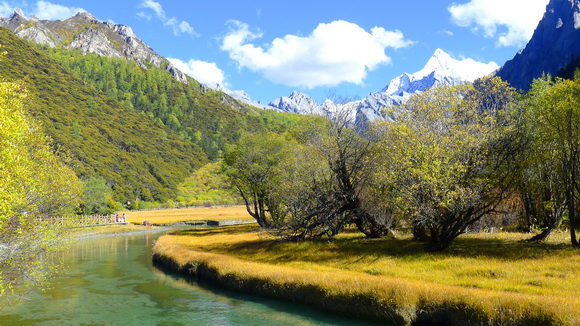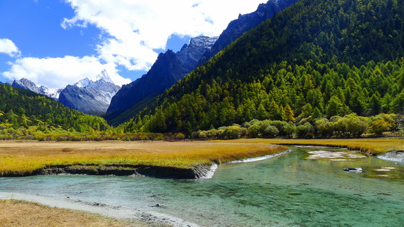 沖古草壩的林木草原,被秋染得亮黃多彩,貢嘎河水川流不息。