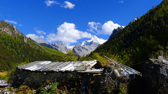 從扎灌崩步行500公尺,前往沖古草壩,遇見了海拔5958公尺矗在前方的夏諾多吉神山。