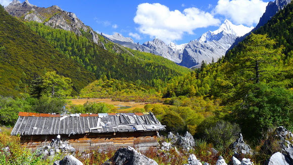 沖古草壩山谷上的藏寨和夏諾多吉神山,唯有當地藏民才能居住於景區內。