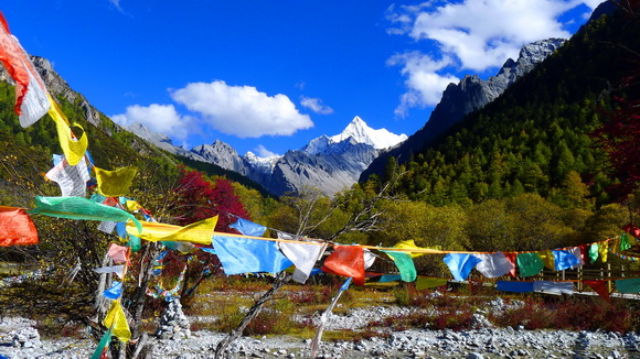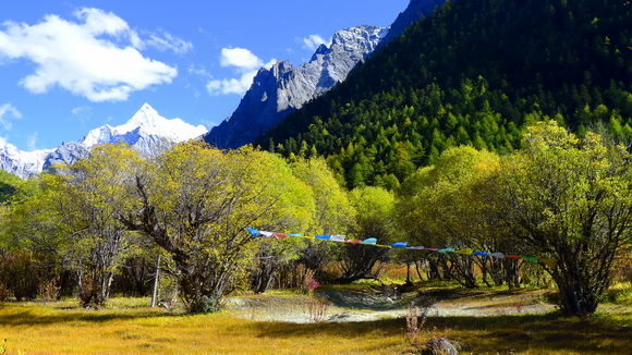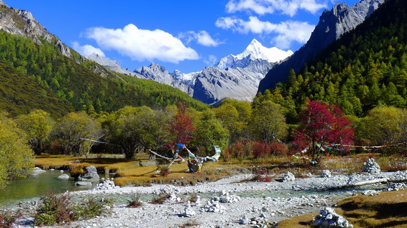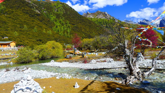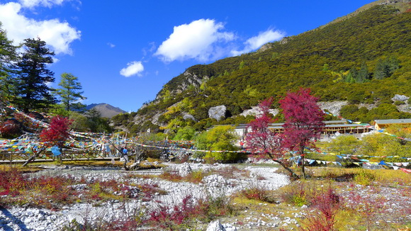 白石頭、風馬旗、紅葉、黃樹林組成了讓人驚豔的漂亮仙境。