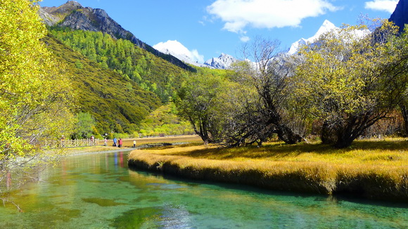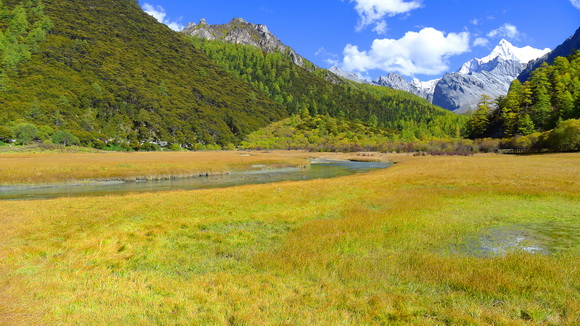 沖古草壩最美就是這一彎溪流和厚厚的草甸,春天蒼翠野花盛開,秋天變黃顏色誘人。