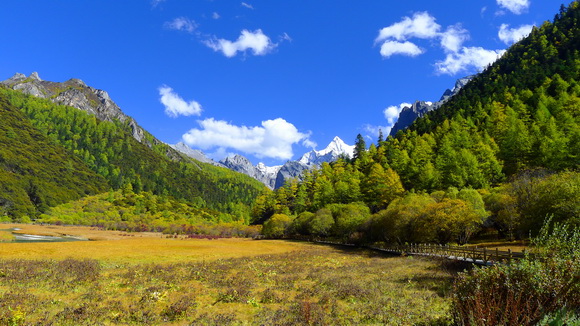 雪山、森林、河流、草原還有一條長長漂亮的木棧道,美麗的高原風光。
