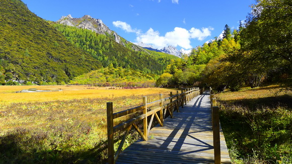 沖古草壩上的木棧道,這一條木棧道也是最近才完成通行。長長的木棧道可通到6.7公里漂亮的洛絨牛場,沿途的景致美得教人難忘。記住,到此一遊一定要走它一趟,雖然得花2個多小時但絕對值得。