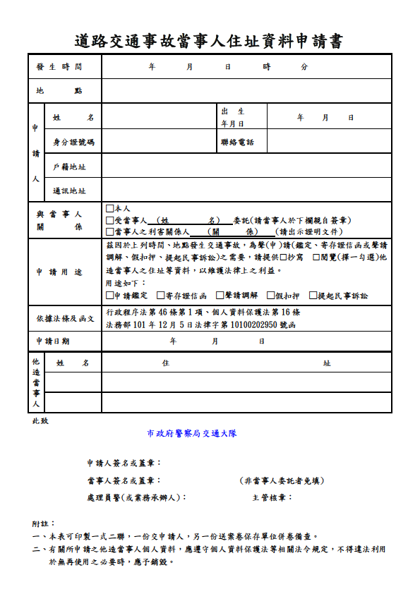 道路交通事故當事人住址資料申請書