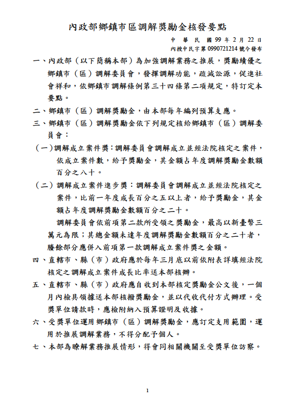 內政部鄉鎮市區調解獎勵金核發要點