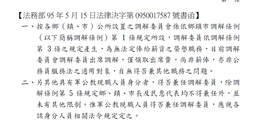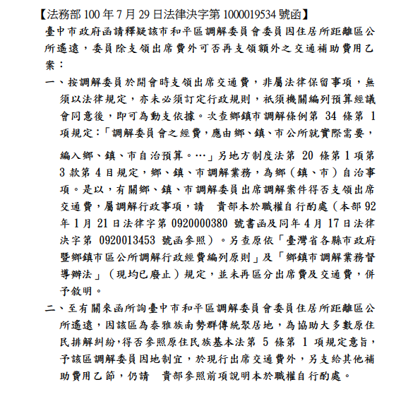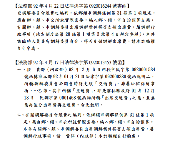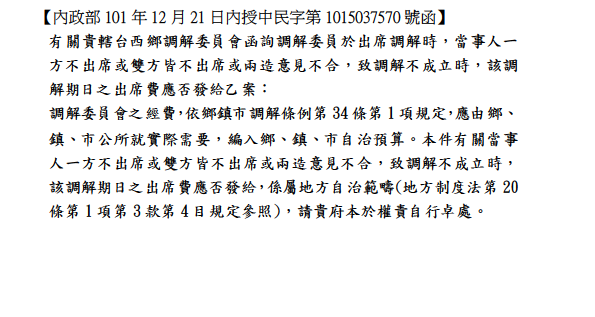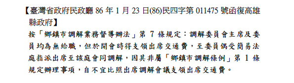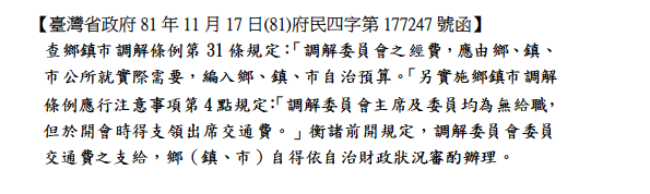 有關調解委員會主席及委員為無給職及出席交通費之函釋
