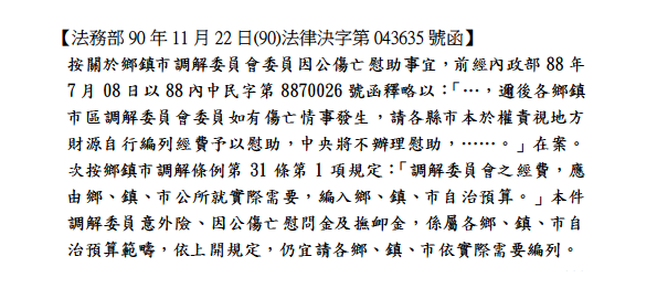 有關調解委員會主席及委員為無給職及出席交通費之函釋
