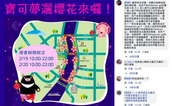 高雄燈會藝術節粉絲頁昨日發文,「為了讓燈會再掀活動高潮,市府觀光局增加寶可夢撒花活動」,要於今明兩天於愛河河畔連續24小時撒櫻花。並為貼文加上「賞燈還可抓稀有怪」的標籤。把灑花活動塑造成特別的寶可夢活動,讓寶可夢玩家們感到相當錯扼,而灑花並不會吸引稀有怪現身也讓人質疑此活動是「作假」,意圖欺騙玩家。