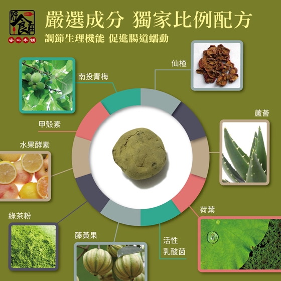 成分:梅子、鹽、益生醣、旃那葉、仙楂、荷葉、甲殼素、活性乳酸菌、普洱茶、決明子、大豆多醣體、綠茶粉、蘆薈粉。
