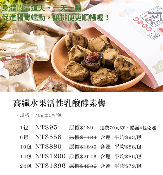 商品訊息簡述: 平均每包最低只要79元起(4包免運)即可享有高纖水果活性乳酸酵素梅1包/6包/10包/14包/24包(70g±5%/包)?