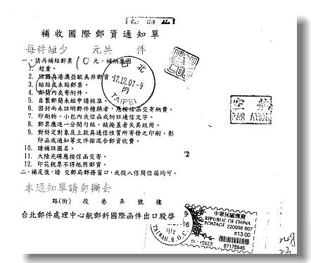 怎料到這星期三(12/19),我收到某一張寄往美國的卡片竟遭退回,卡片略為損壞,上面還貼了一張郵資不足十元的通知,喵公簡直氣壞了。隔天早上喵公打電話到相關單位,把經辦人員報怨一頓,這是你們的作業疏忽,少算了十元,卻耽誤了我們的郵件時間長達五天,我們的供應商無法在耶誕節前收到賀卡,影響了我們與供應商之間的關係,這是身為運輸業者該有的行為嗎?