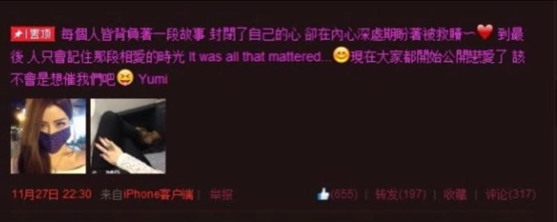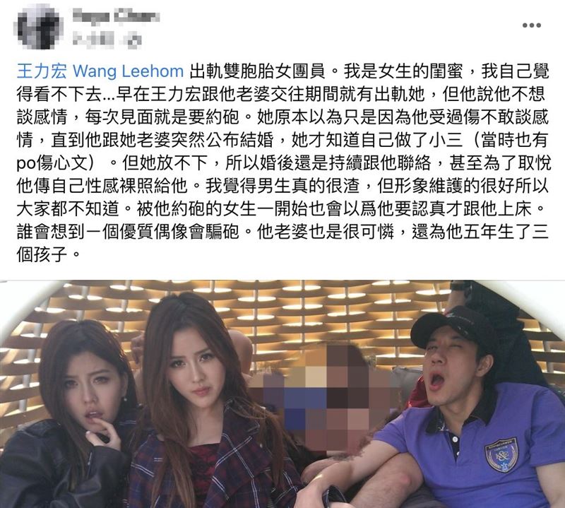 爆料者在發文中提到,「王力宏 Wang Leehom 出軌雙胞胎女團員。我是女生的閨蜜,我自己覺得看不下去…早在王力宏跟他老婆交往期間就有出軌她,但他說他不想談感情,每次見面就是要約砲。她原本以為只是因為他受過傷不敢談感情,直到他跟她老婆突然公布結婚,她才知道自己做了小三(當時也有po傷心文)。」另外還直指Yumi儘管知道對方結婚,仍放不下這段感情,還說「他老婆也是很可憐,還為他五年生了三個孩子」。