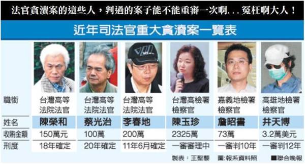 最近兩起重大司法醜聞 : 一個是台中高分院法官胡景彬案,收賄養妻妾,登記在三個老婆及六個子女名下不明財產竟多達三億餘元 , 另一個是台灣高檢署檢察官陳玉珍長期包庇賭博性電玩業者,並收賄2325萬元。離譜的是,陳玉珍早期任職的前板橋地檢署與台灣高檢署對於陳玉珍收賄與關說等事實渾然不覺,收賄期間的考績都是「甲等」,評語則是「腳踏實地」、「視野宏觀」、「認真負責」等,品 德操守項目等級為「A(足為楷模)」等考評,相當諷刺。