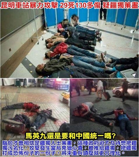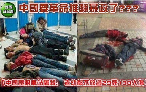 雲南昆明火車站周六晚間突然傳出恐怖襲擊事件,約20多名男女暴徒,清一色蒙面並穿黑衣,手持長刀,走進車站廣場及售票大堂後見人就砍。現場到處是被砍傷的旅客,不少人倒在地,血漬斑斑。美聯社最新消息稱,至少已有33死、143傷,中國官媒已將此案定調為新疆分裂勢力策劃製造的嚴重暴力恐怖事件。