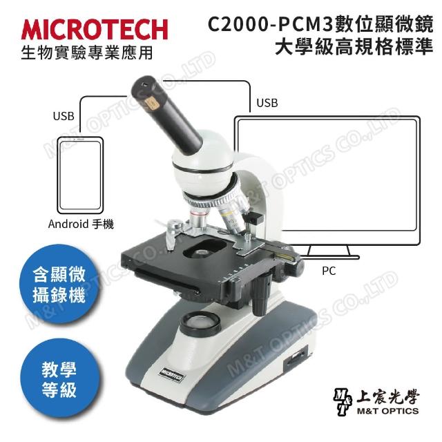 知名品牌MICROTECH C2000-PC數位顯微鏡電腦螢幕即看即拍! 總代理公司貨品質有保障! ? ?附電腦用顯微數位攝影裝置,最大畫面達1280 x 1024,電腦螢幕上即時呈現顯微世界,大人小孩都輕鬆愉快!並可直接拍攝或錄影,做紀錄寫報告方便無比。?採用大學級生物科教學高規格標準而設計的優秀機型。?新式主流全鋁合金鑄造鏡身,堅固耐用,外型優美。?人性化貼心設計、操作簡便、 保養容易、延長使用期限。?適用年齡8歲~80歲,老少咸宜,悠遊顯微世界。?配備完善,一應具全,免除升級煩惱 (詳見規格配備說明)。 ? 使用於動植物細胞組織觀察、病理切片觀察、水質檢驗、生命科學實驗。 PC130NEW數位顯微攝錄機 ? 安裝簡單,換下目鏡直接插上,採用USB2.0介面傳輸。影像可調整亮度、對比度、飽和度、色度、伽瑪、清晰度,含動靜態測量功能。在電腦上可直接看到影像,及拍照和錄影功能。通用一般23/30mm的目鏡筒規格。