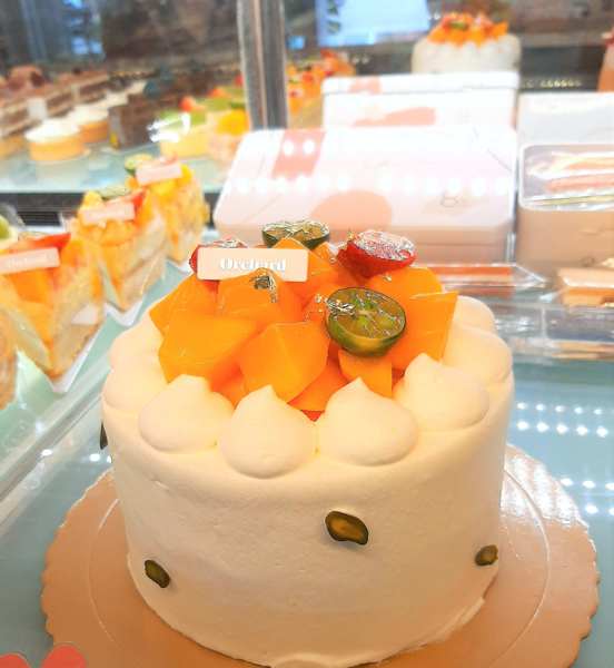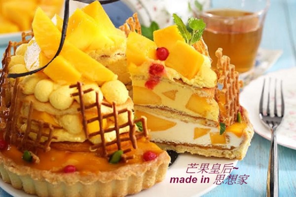全程使用法國進口瑪斯卡邦乳酪、100%芒果泥調理,表層為「枋山愛文芒果」,第2層夾餡:「芒果提拉米蘇夾芒果丁」,第3層內餡「義式乳酪夾芒果丁」,雙層蛋糕為「君度香橙手指餅」,第4種內餡「雙層芒果庫利」,底層「法式酥脆塔餅」…