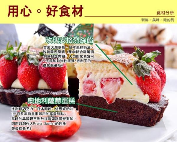 奧地利薩赫蛋糕:比利時巧克力、日本麵粉、依思妮奶油。(一百多年前皇家御用的高貴甜點;當時的奧國親王對於這款蛋糕讚譽有加,因而以創作人Franz Sacher的姓氏替蛋糕命名)