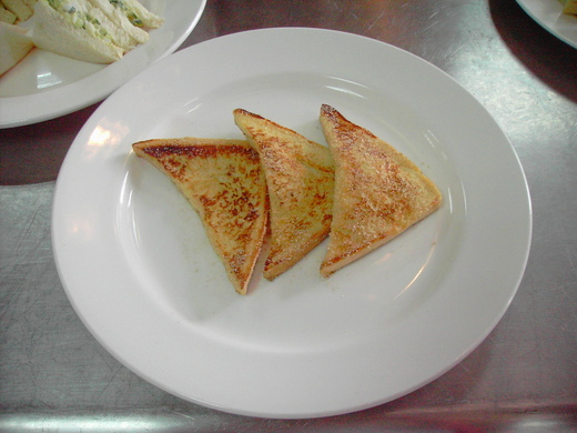 (3)土司沾(2)不超過2秒,以奶油+沙拉油煎至金黃色。