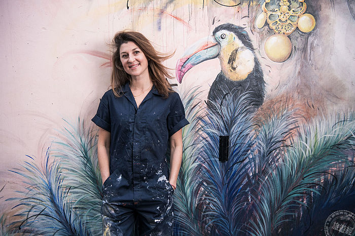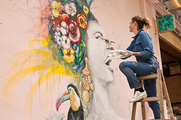而在香港塗鴨藝術界,以笑容具感染力的人物著稱,一直以來都受到民眾喜歡的作品,這畫家是居住在香港的法國籍藝術家 Elsa Jean de Dieu,曾去香港一定見過她的畫作,她有多幅創作代表著正能量,積極向上的精神,在香港街頭許多地方都看得到她的作品,其中包括在歌賦街(九記牛腩那條街)上的「神力女超人」!