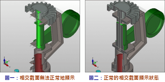 請抽空測試一下您的 KeyCreator,在 V12 之後各版本中的 檢視>動態剖切平面>動態剖切平面、立體剖視截面、動態等厚切片 等三項功能,是否發生了如圖一所示,實體零件與剖切平面的相交截面,無法正常顯示的問題? 若無,恭喜您的系統一切平安! 若不幸地遇到了這個問題,別擔心,本中心將協助您將其修正。