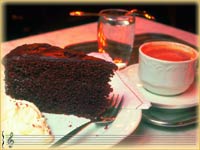 重頭戲來了,正宗的沙河蛋糕即將登場,這個名震四方的奧地利國寶甜點,是在軟綿綿的海綿蛋糕中間夾一層杏桃果醬,外面則是澆上大量的巧克力,再來就是、就是、就是我不知道啦,因為人家沒吃啦。