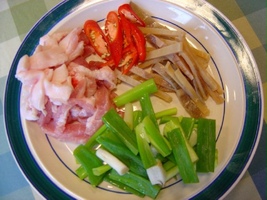 1五花肉分肥瘦切成條狀,青蔥洗淨,分切成蔥白及青蔥段。