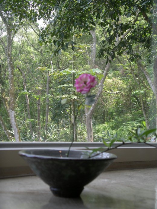 沿著蜿蜒小路來到館前大門,從水泥鋪設的斜坡一眼望去,一邊是石頭駁坎,上頭是錯落有致的竹林,一邊則是用陶缸種上狀元紅排列而成的綠籬,小葉欖仁也在抽著新綠,走著走著,我看到五色鳥輕盈的在樹枝上跳上跳下,心想牠的雀躍是否與我相同?都是因為呼吸著滿滿的綠色能量,而不由自主的愉悅起來。