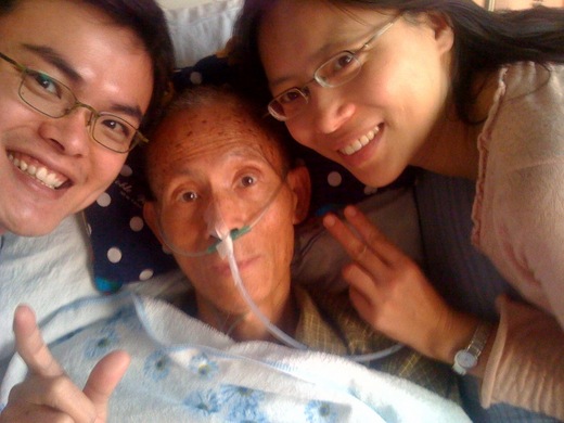 就這樣吵吵鬧鬧的一直到西陽夕照, 訪客散去時, 病房裡才漸漸安靜下來。我和姊姊一面幫老爸洗腳擦乳液, 一面聊著我早上笨手笨腳打翻便盆, 而「拾金不昧」的精采回顧。老爸稱讚姊姊腳底按摩的技術好, 又誇我早上勇氣可嘉, 將來會成為比他成功的父親。自從我們上大學, 爸爸因公北調台中後, 已經不記得上次是什麼時候, 我們這麼親密的共處一室了。這時姊姊也忍不住要拿出相機, 要把這一刻永遠留下來。在十幾張自拍嘗試裡, 只有這張比較成功。相片裡, 姊姊用的是很芭樂的 V 手勢, 老爸用的是更古董的數字七手勢, 而我因為手長要負責拿相機, 最後弄的只有四分之三個頭入鏡。