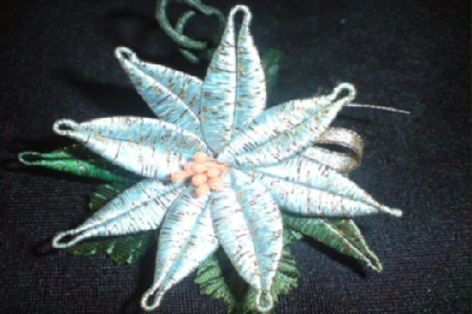 在紙咭上面,要重覆做八片花辮及兩片葉子,所以做一朵繡線花是很費功