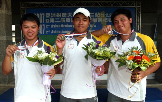 亞洲射箭大獎賽暨亞洲青年射箭錦標賽,中華隊郭振維(中)、陳韋澤(左)、王正邦今天拿下一金一銀一銅。