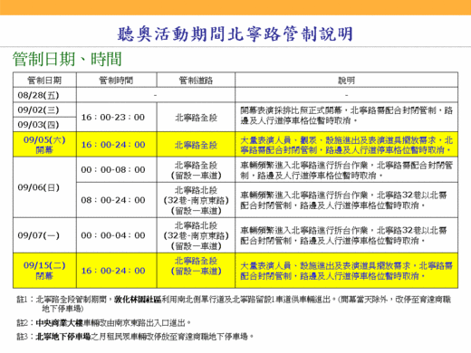 除了開幕當天的交通管制,北寧路於彩排、拆台作業及閉幕活動,仍有下列交通管制:9月2日及9月3日16時至23時封閉北寧路全段(南京東路-八德路);9月6日0時至8時封閉北寧路全段(南京東路-八德路);9月6日8時至24時封閉北寧路北段(32巷-南京東路);9月7日0時至24時封閉北寧路北段(32巷-南京東路);9月15日16時至24時封閉北寧路全段(南京東路-八德路)。