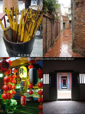 Image:由左上到又下,龍山寺裡的籤、九曲巷、吳敦厚燈籠、丁家大宅。2005.12.30~31攝於鹿港。