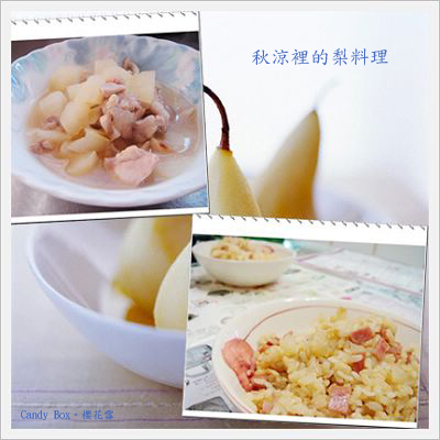 光喝湯不會飽,該來點米飯墊底。「洋蔥火腿水梨飯」也是很容易上手的料理。秋天吃炊飯最適合不過了。將洋蔥、火腿、水梨切丁,以些許胡椒和醬油醃漬。將米洗好,再把洋蔥、火腿和水梨連同生米放入電鍋中,按下炊飯鍵即可。洋蔥的香、火腿的鹹,襯托出水梨的甜,真是好吃啊。﹝不過要注意的是,因為梨子會出水,所以原本煮飯的水不需要加太多。例如一杯米放一杯水,加入梨子的話就不需要加到一杯全滿。當然喜歡吃濕濕軟軟飯的話就無所謂了。﹞