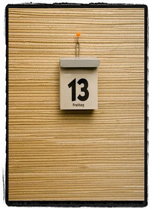 今天是十三號星期五,根據維基百科說,『當13日正逢星期五時,即為「13號星期五」。13號星期五(或黑色星期五)是在西方文化中,對任何月份的13日正逢星期五之稱呼。在英語系和葡萄牙語系國家的文化當中,十三號星期五被迷信者認為是不幸、不吉利的日子。在許多其他的文化當中也可見到類似的迷信,例如在希臘和西班牙等國家的文化也視「13號星期二」為不吉利的一天。』