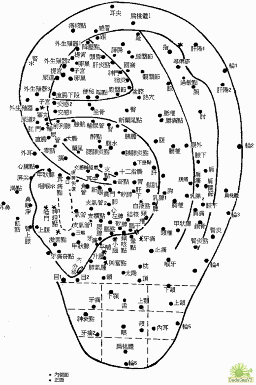 人的耳朵確實是一個非常神奇的地方,如果我們把耳朵上的主要穴位連起來,其形狀恰似倒置於子宮中的胎兒。而人體各器官和組織在耳朵上都有相應的刺激點,一旦受到疾病侵犯,耳上的某個特定穴位就會產生預警信號。因此,當刺激某個耳穴時,就可以診斷和治療體內相應部位的疾病,很多中醫高手還可以通過觀察耳部皮膚顏色的深淺變化,有無凹凸變形、脫屑、毛細血管是否充盈等現象來協助診斷疾病。比如在冠心病病人的耳垂處常可見到一條斜形的皺痕,此皺痕被稱為「冠心病溝」。耳垂對血管缺血現象很敏感,一旦冠狀動脈硬化引起冠心病時,耳垂組織就會發生缺血現象,併發生一定程度的萎縮變化,依據這條斜線狀的皺痕來診斷冠心病,準確率可達90%。人們在醫院裏也可以見到醫生在患者耳朵上某個特定的穴位埋藥籽或埋針,以此治療各類疾病。