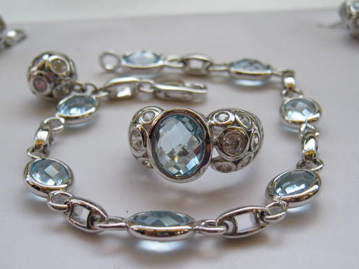 國際R925銀鍍銠鑲水藍拓帕石蘇聯鑽頂級CZ鑽套組