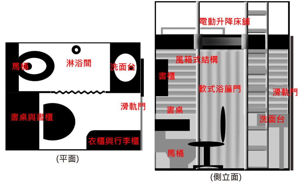 這項設計最重要的關鍵是衛浴與臥房合一。由於單人房睡覺與使用衛浴不可能並存,所以設計了可升降的床舖,當不睡覺時床舖上升到房頂,下方留出完整的衛浴空間,當要睡覺時床舖下降到半高(即馬桶與洗面槽以上的高度),可登上入睡。