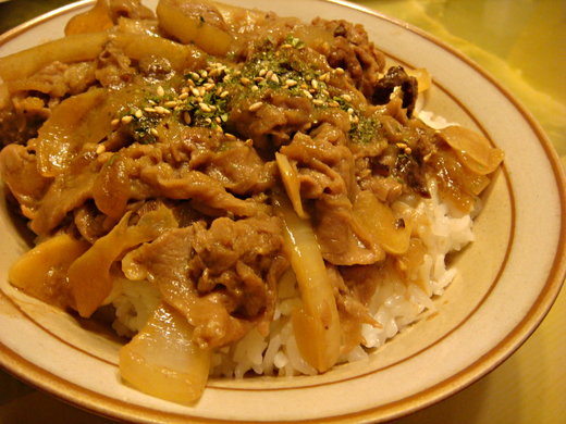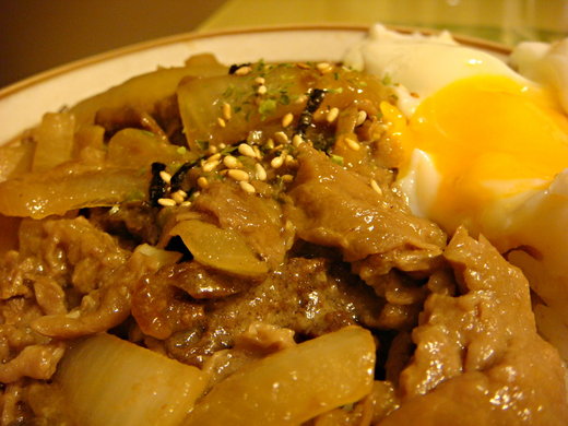 圓亮晶透的白飯上鋪滿著鹹甜香俱全的牛肉