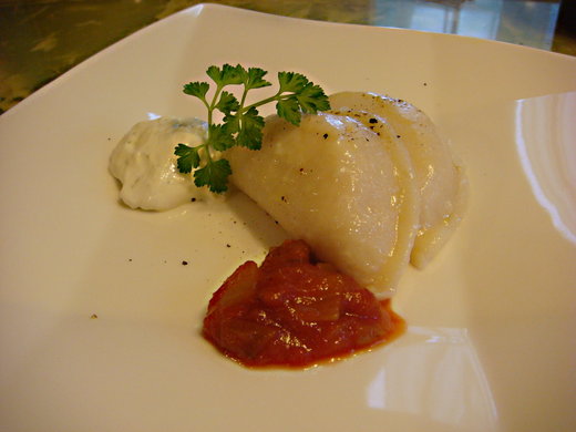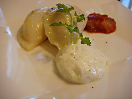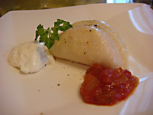 馬鈴薯起司餃佐香料洋蔥酸奶醬與番茄沙沙醬