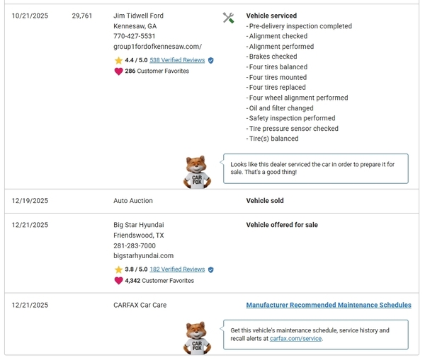 但你這台有清楚的CARFAX交車前檢查、輪胎與定位紀錄,這代表經銷商不是把拍賣場的車直接丟給下一手,而是有成本投入的。