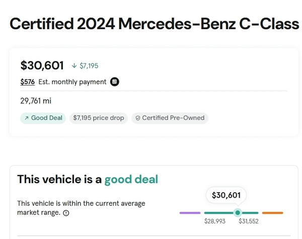 這台 2024 Mercedes-Benz C300 4MATIC,從 40,953 美金一路修正到 30,601 美金,沒有一次性崩跌,也沒有事故、沒有異常新聞,它只是很安靜地、一段一段地,被市場帶回該站的位置。
