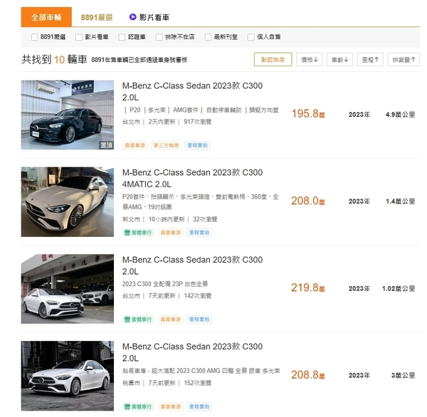 2023 年式 C300,我設定是白色外觀,在台灣的二手價格就是 195~219 萬這一帶。