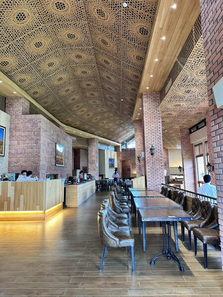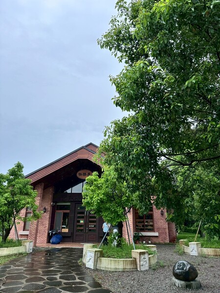 藏身於彌勒佛銅像的身後,橘紅色歐風建築與幽靜的落羽松林構織出宛如國外的風景,而內部更是讓人驚艷,挑高兩層樓的空間,營造宏偉大器之感,兩側玻璃大窗映著峨眉湖光水色,美的令人心醉。