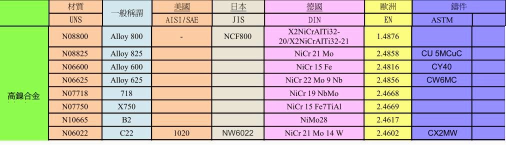 | 高鎳合金(Inconel alloy)包含Hastelloy 合金-法規對照 |