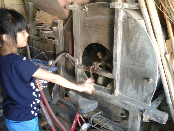 妹妹自得其樂的把玩著碾稻機,這是課本裡體驗不到的農村樂!