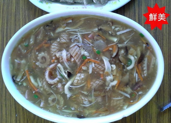 海鮮羹裡滿滿的鱿魚,湯頭鮮美,鹹味中帶著淡淡的甜(不是偏南部口味的甜羹)