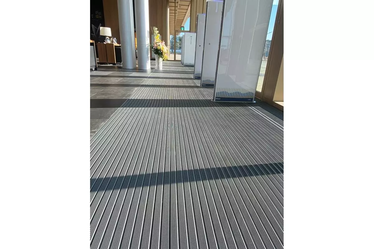 鋁骨架地墊可搭配多種材質,包括美國毯、荷蘭毯、合成PVC止滑條等,依使用需求自由選配,兼顧刮泥、除塵、止滑與整體美觀。針對各處出入口、商辦門廳、大樓風除室等高人流區域,更能有效刮除鞋底泥沙,減少室內清潔負擔。