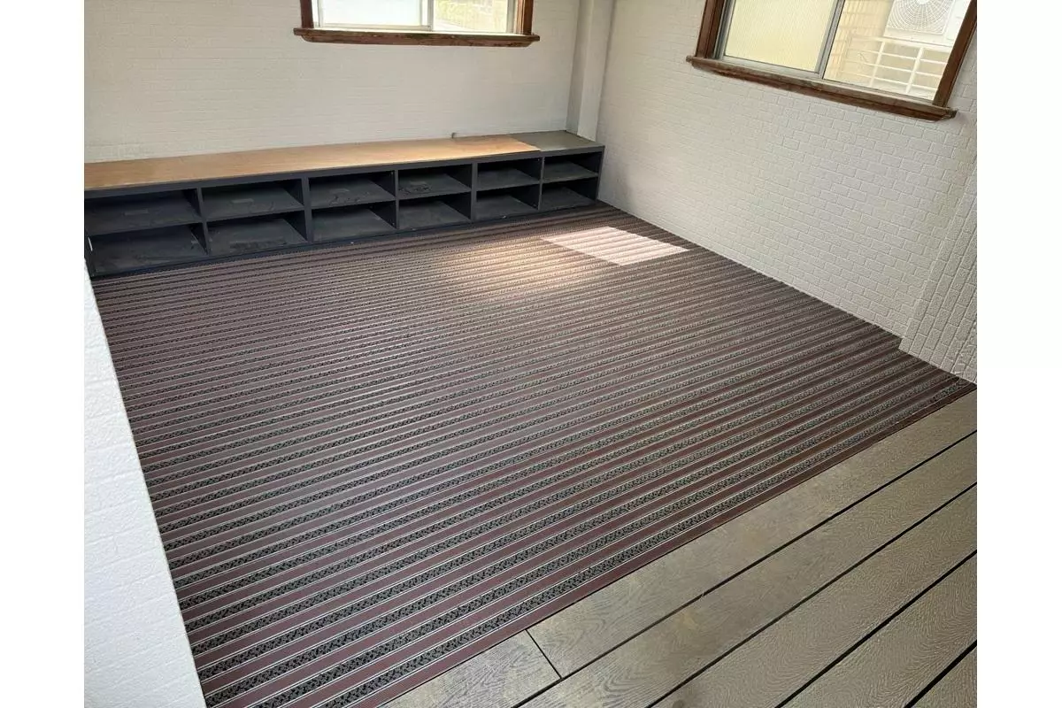 施工採用專屬新工法,克服高低差問題,於工程後期再安裝地墊使內外平整美觀。完工後,大幅降低室內地面整潔與人力清潔成本,獲得管理單位高度肯定。