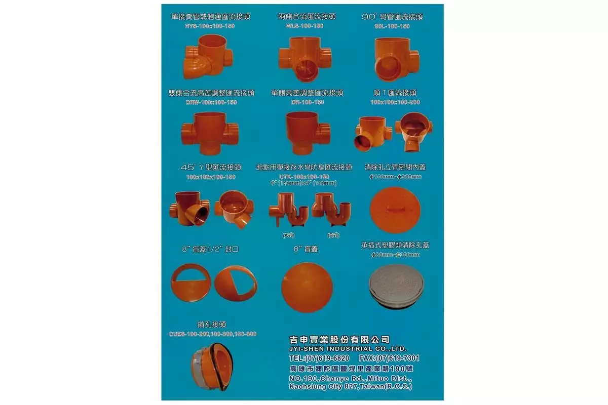 UPVC塑膠管接頭配件(給排水用管件、下水道工程用陰井與匯流接頭) 等產品的研發與製造。