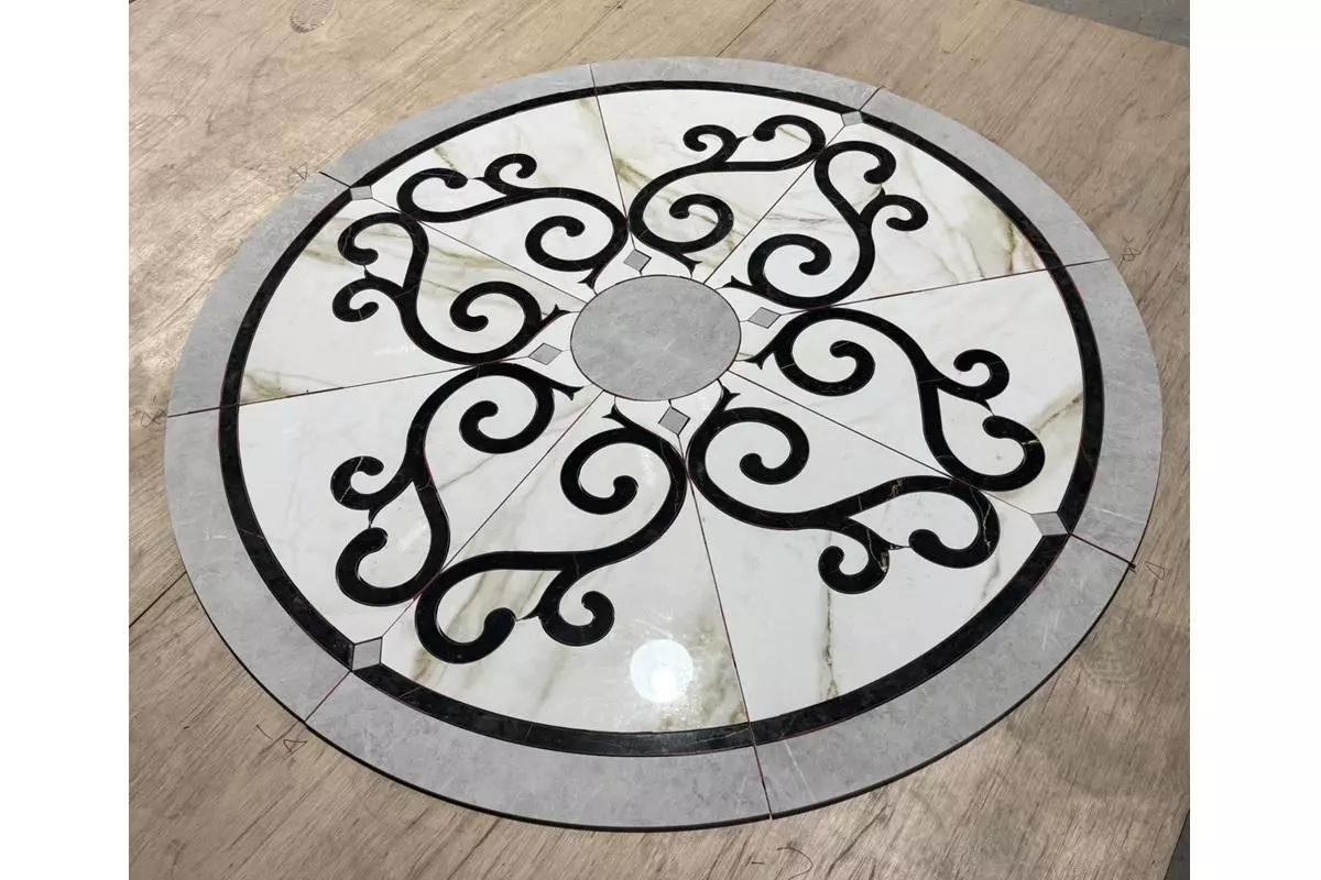 某高端住宅建案在入口大廳地坪設計上,希望呈現兼具藝術美感與精緻工藝的石材拼花圖案,以提升整體建築質感。設計團隊規劃以多種天然石材拼接出對稱圖騰,但由於圖案線條細緻複雜,傳統加工方式難以達到精準效果,因此委託台瓷企業進行水刀切割與拼花製作。